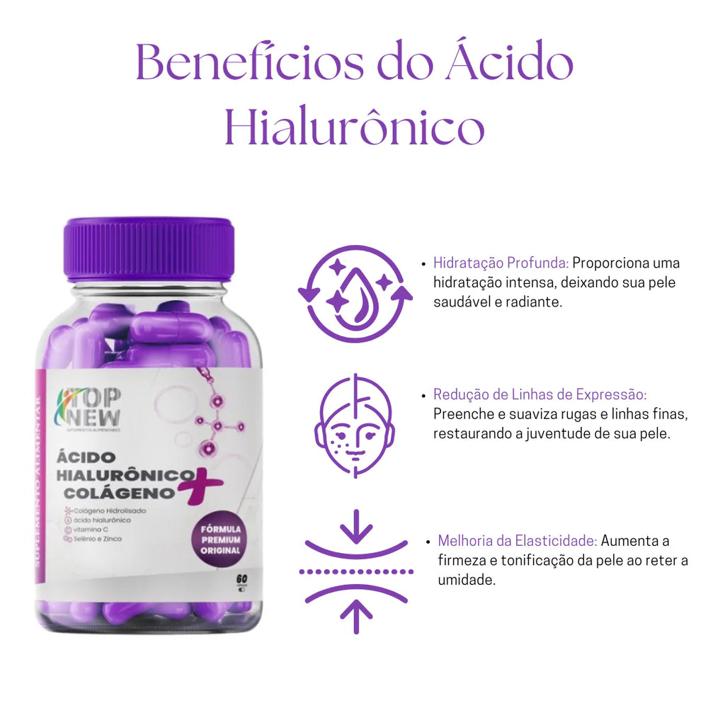 Descubra o Segredo da Juventude Eterna! O Ácido Hialurônico é um ingrediente poderoso para a saúde e beleza da pele. Com a idade, a produção natural diminui, resultando em sinais de envelhecimento. Mas não se preocupe! Nosso suplemento é a solução ideal.